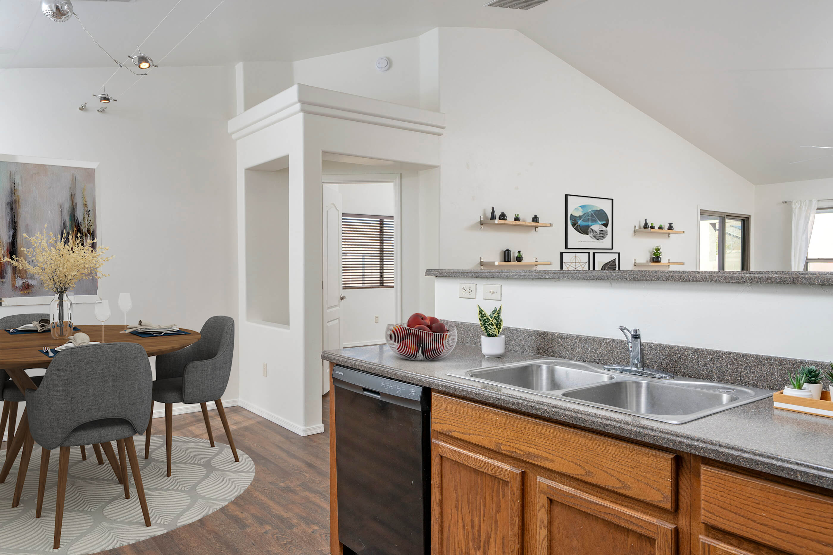 effortlessly into a cheerful dining space and an open-concept kitchen outfitted